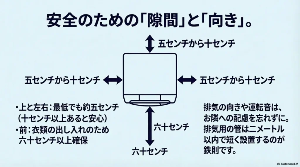背面の距離については、法的には0mm(密着)でも認められる場合がありますが、実際には数センチの余裕を持たせることで、背面の排湿トップの状態確認や、砂埃の掃除が格段に楽になります。